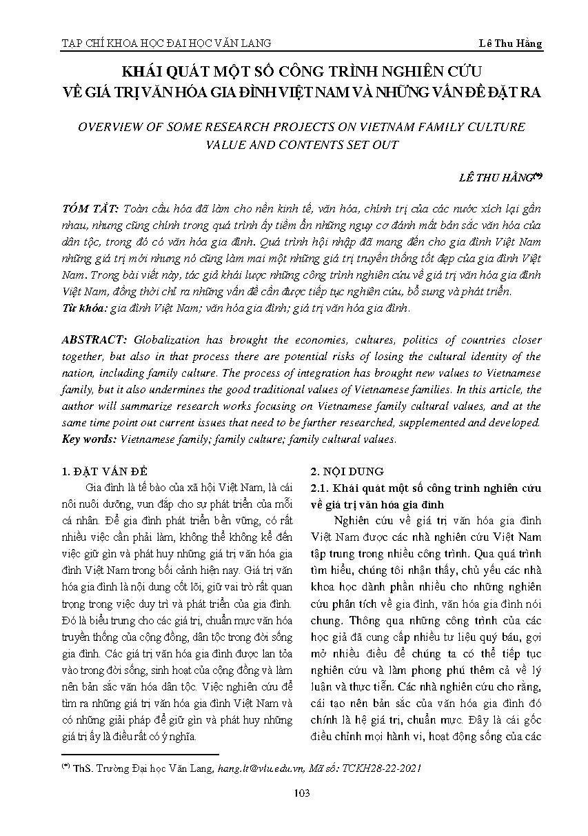Khái quát một số công trình nghiên cứu về giá trị văn hóa gia đình Việt Nam và những vấn đề đặt ra = Overview of some research projects on Vietnam family culture value and contents set out