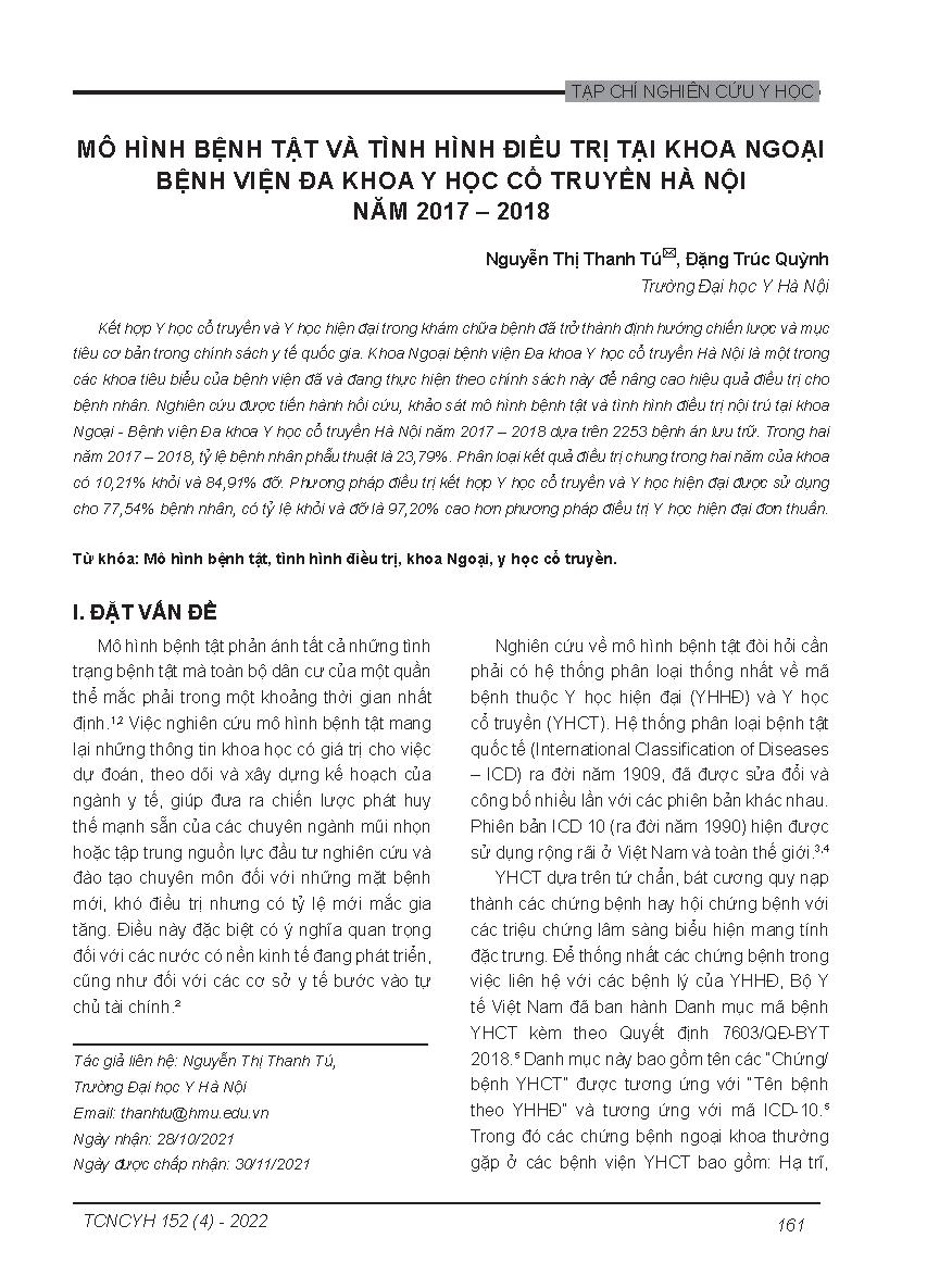 Mô hình bệnh tật và tình hình điều trị tại Khoa Ngoại Bệnh viện Đa khoa Y học cổ truyền Hà Nội năm 2017 – 2018 = The pattern of diseases and treatment situation in the department of surgery – hanoi general hospital of traditional medicine in 2017 – 2018