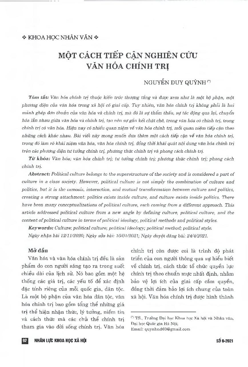 Một cách tiếp cận nghiên cứu văn hóa chính trị = An approach to the study of political culture