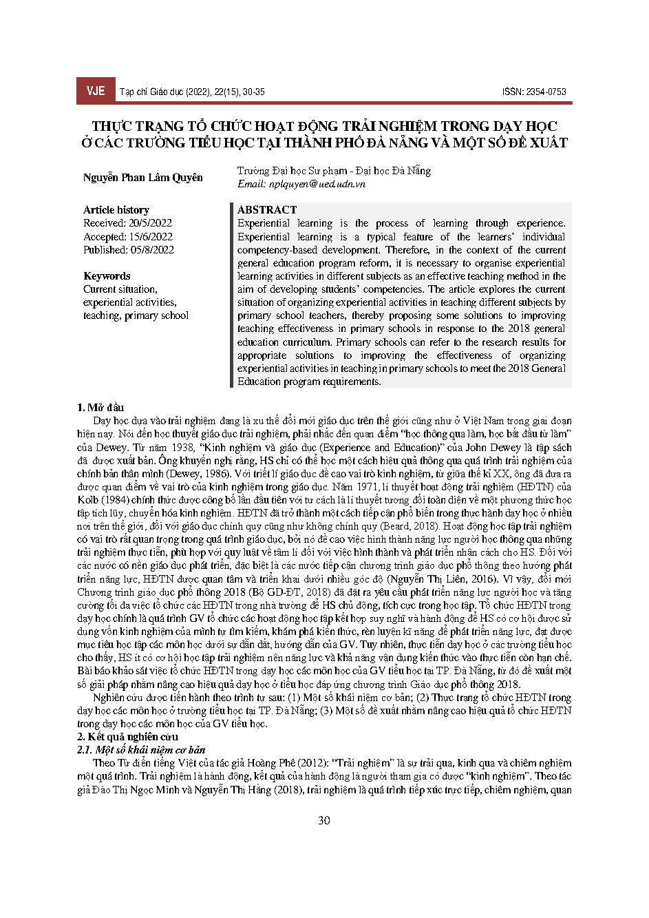 Thực trạng tổ chức hoạt động trải nghiệm trong dạy học ở các trường tiểu học tại thành phố đà nẵng và một số đề xuất = Actual situation of organizing experiential activities in teaching in primary schools in Danang city and some suggestions