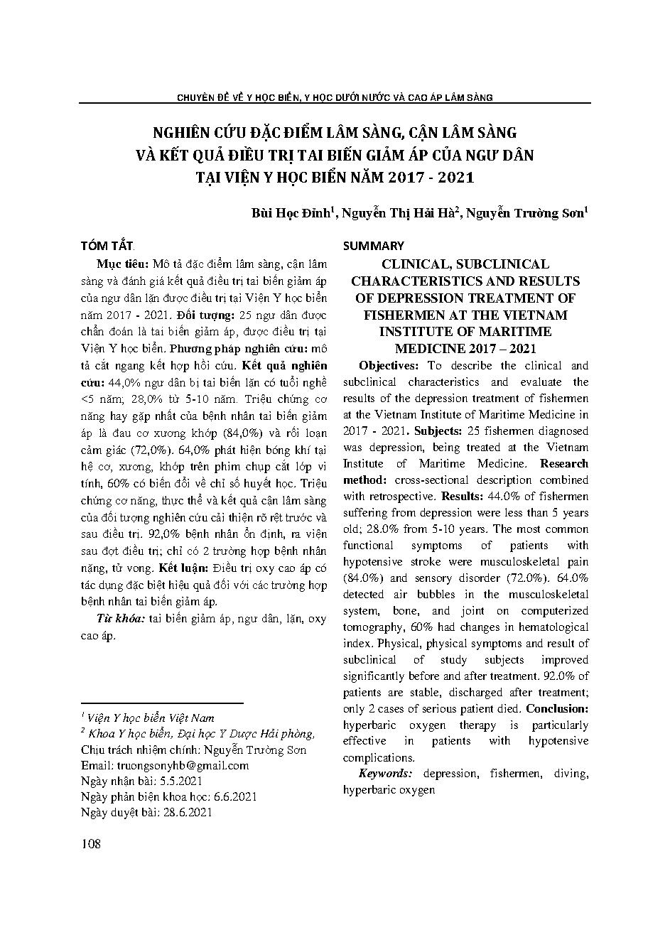 Nghiên cứu đặc điểm lâm sàng, cận lâm sàng và kết quả điều trị tai biến giảm áp của ngư dân tại Viện Y học biển năm 2017 - 2021
