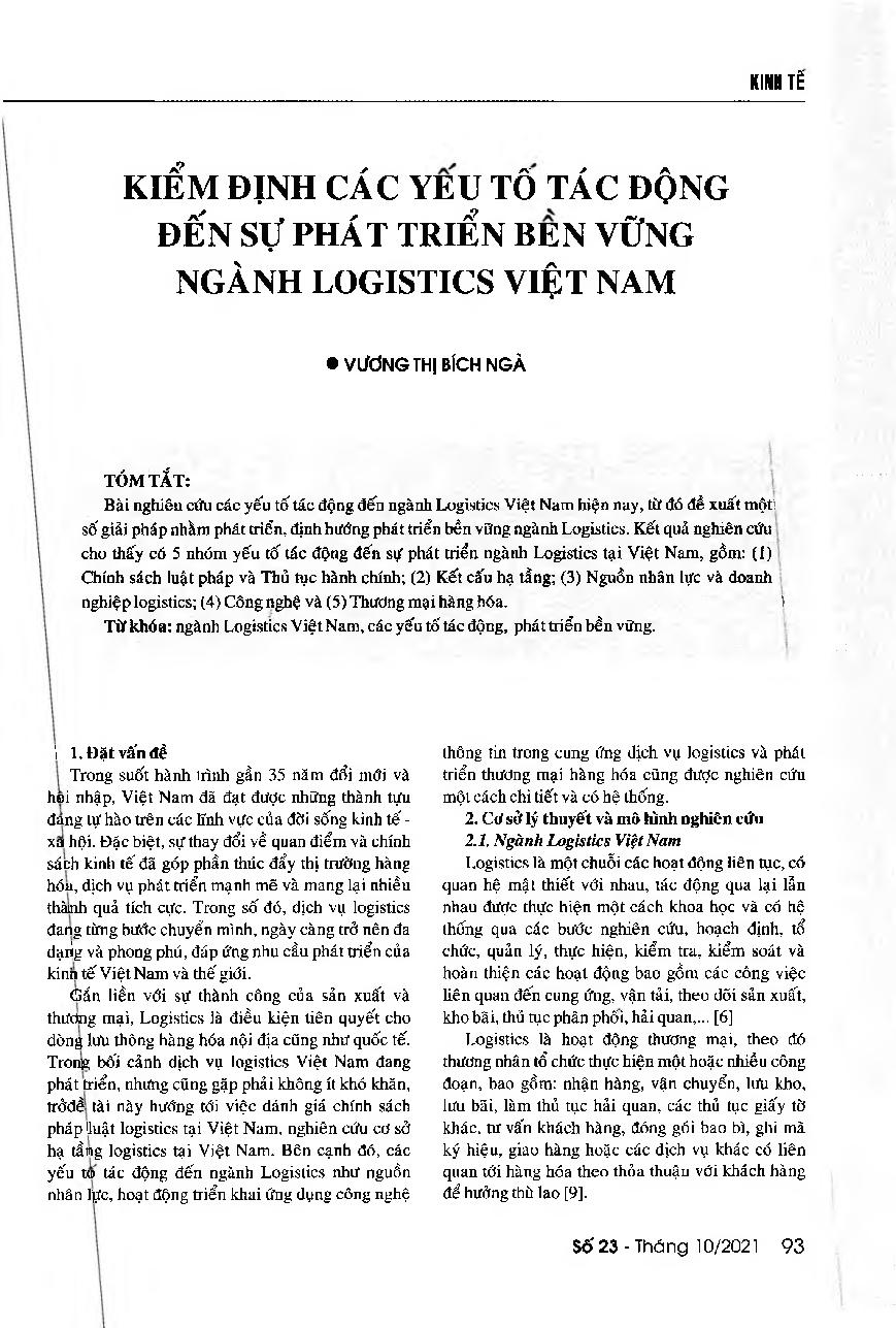 Kiểm định các yếu tố tác động đến sự phát triển bền vững ngành Logistics Việt Nam = Examining factors affecting the sustainable development of Vietnam's logistics industry
