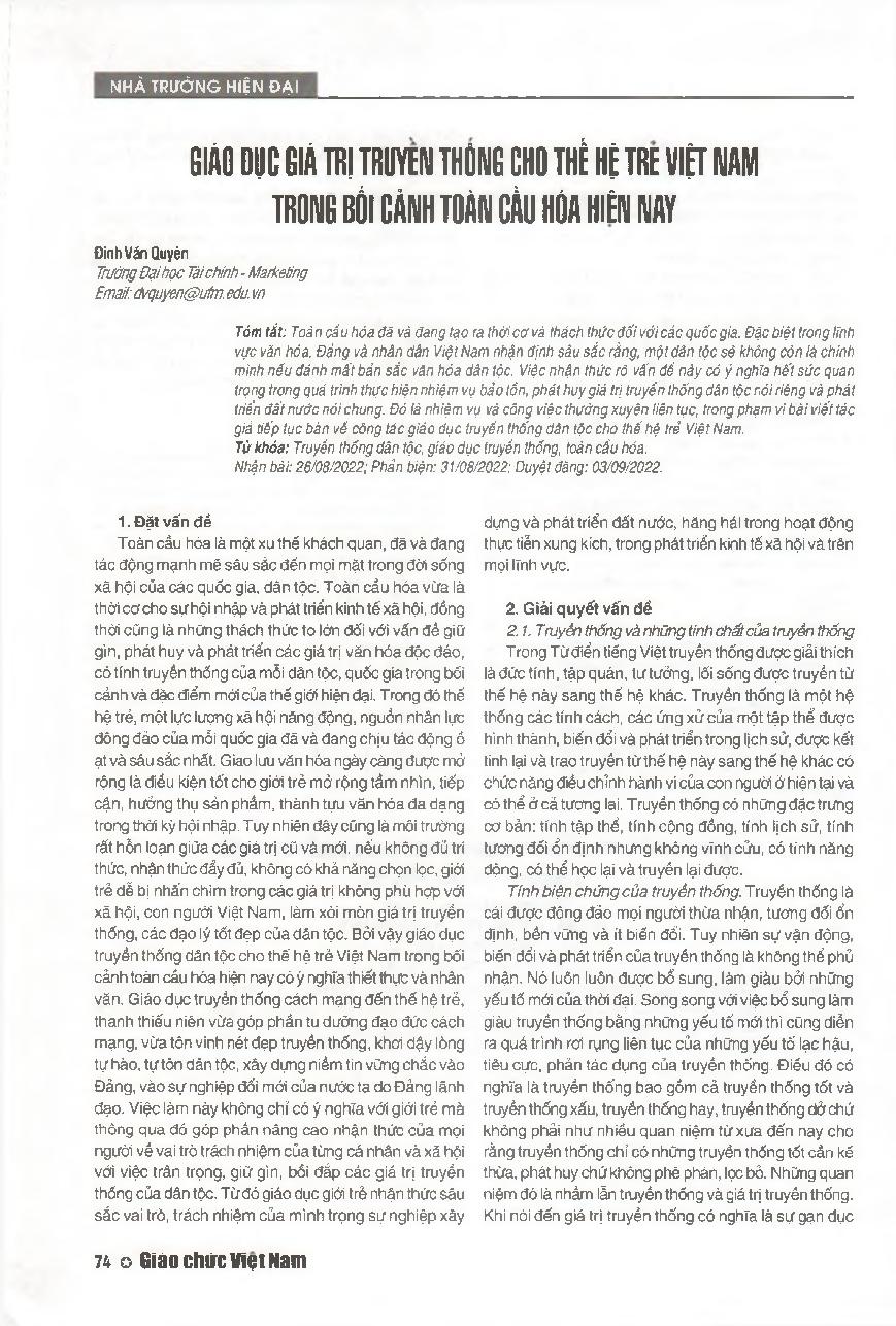 Giáo dục giá trị truyền thống cho thế hệ trẻ Việt Nam trong bối cảnh toàn cầu hóa hiện nay = Educating traditional values for the young generation of Vietnam in the context of globalization today.