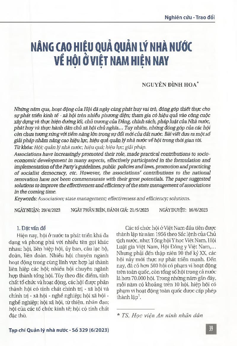 Nâng cao hiệu quả quản lý nhà nước về hội ở Việt Nam hiện nay = Improve the effectiveness of state management of associations in Vietnam today