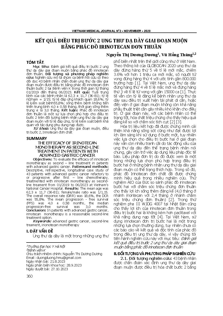 Kết quả điều trị bước 2 ung thư dạ dày giai đoạn muộn bằng phác đồ Irinotecan đơn thuần = The efficacy of irinotecan monotherapy as second-line treatment in patients with advanced gastric cancer