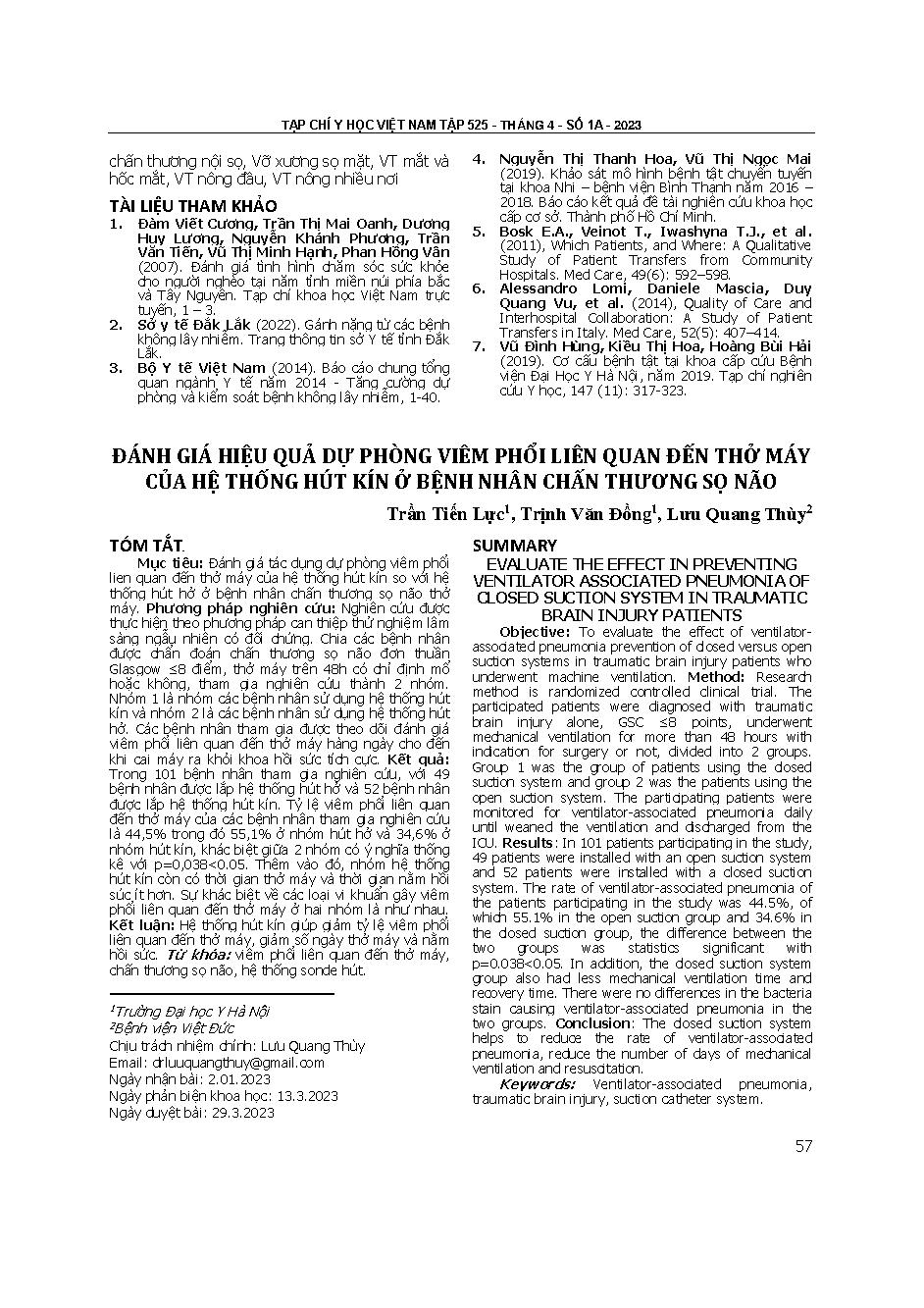Đánh giá hiệu quả dự phòng viêm phổi liên quan đến thở máy của hệ thống hút kín ở bệnh nhân chấn thương sọ não = Evaluate the effect in preventing ventilator associated pneumonia of closed suction system in traumatic brain injury patients