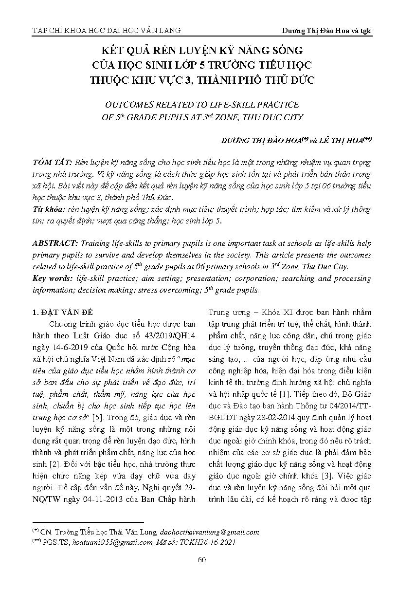 Kết quả rèn luyện kỹ năng sống của học sinh lớp 5 trường tiểu học thuộc khu vực 3, thành phố Thủ Đức = Outcomes related to life-skill practice of 5th grade pupils at 3rd zone, Thu Duc city