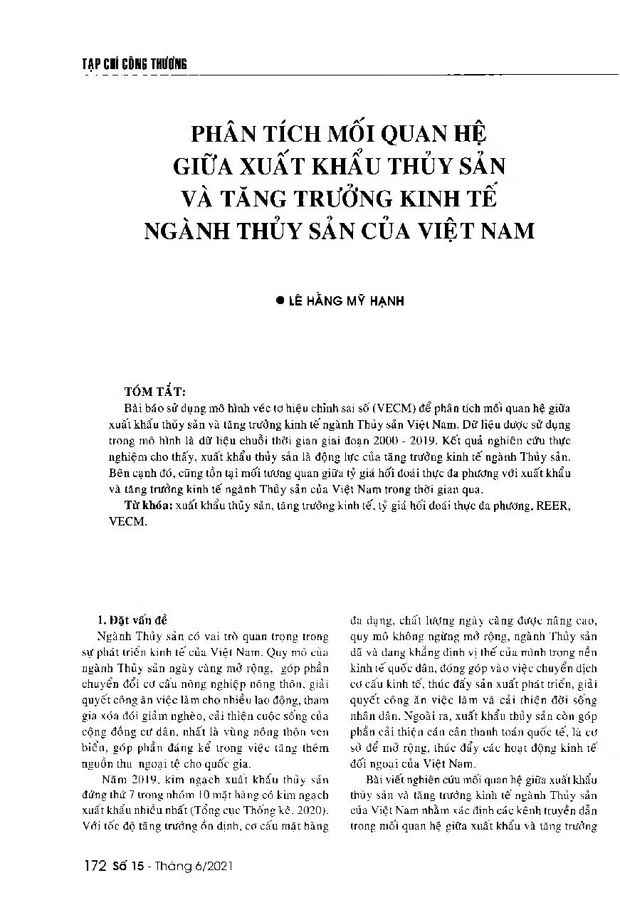 Phân tích mối quan hệ giữa xuất khẩu thủy sản và tăng trưởng kinh tế ngành Thủy sản của Việt Nam = Analyzing the relationship between Vietnam's seafood exports and the country's seafood industry growth rate