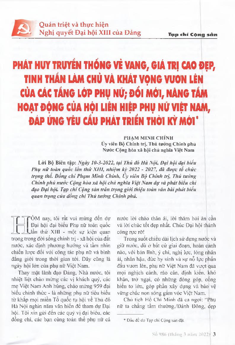 Phát huy truyền thống vẻ vang, giá trị cao đẹp, tinh thần làm chủ và khát vọng vươn lên của các tầng lớp phụ nữ; đổi mới, nâng tầm hoạt động của Hội Liên hiệp Phụ nữ Việt Nam, đáp ứng yêu cầu phát triển thời kỳ mới = Promoting the glorious tradition, nobl