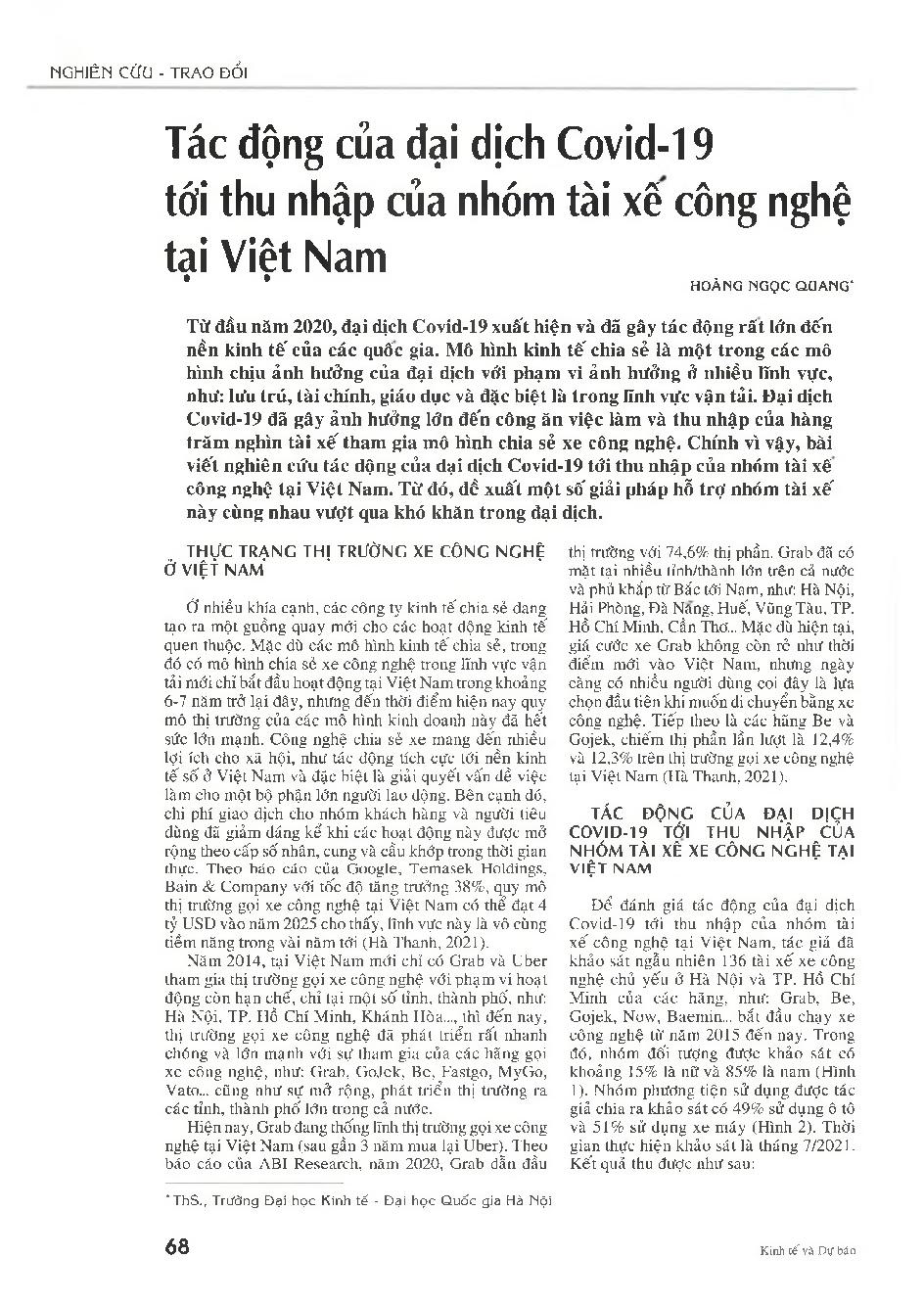Tác động của đại dịch Covid-19 tới thu nhập của nhóm tài xế công nghệ tại Việt Nam