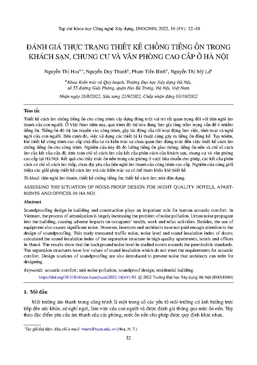 Đánh giá thực trạng thiết kế chống tiếng ồn trong khách sạn, chung cư và văn phòng cao cấp ở Hà Nội = Assessing the situation of noise-proof design for hight quality hotels, apartments and offices in Ha Noi