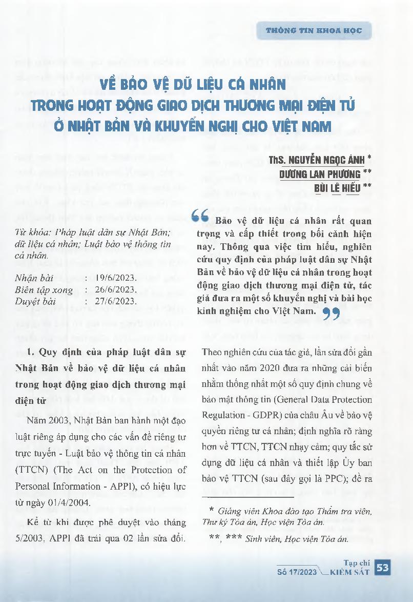 Về bảo vệ dữ liệu cá nhân trong hoạt động giao dịch thương mại điện tử ở Nhật Bản và khuyến nghị cho Việt Nam