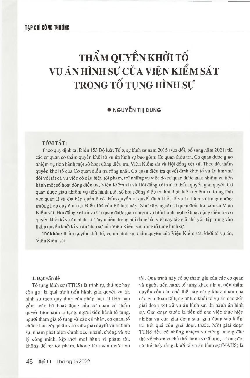 Thẩm quyền khởi tố vụ án hình sự của Viện Kiểm sát trong tố tụng hình sự = Authority to press criminal charges of the procuracy in criminal proceedings