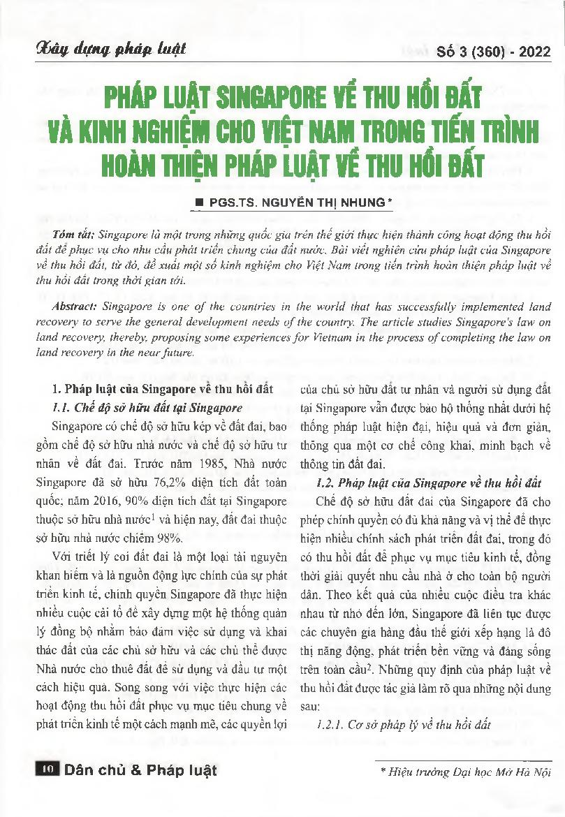Pháp luật Singapore về thu hồi đất và kinh nghiệm cho Việt Nam trong tiến trình hoàn thiện pháp luật về thu hồi đất = Singapore law on land recovery and experience for Vietnam in the process of completing the law on land recovery