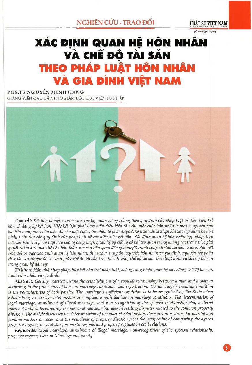 Xác định quan hệ hôn nhân và chế độ tài sản theo pháp luật hôn nhân và gia đình Việt Nam = The determination of the marital relationship, property regime and principles of property division according to Vietnam Law on Marriage and Family