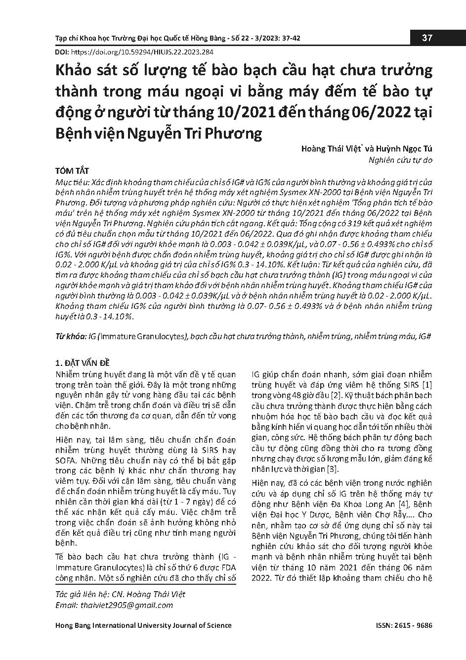 Khảo sát số lượng tế bào bạch cầu hạt chưa trưởng thành trong máu ngoại vi bằng máy đếm tế bào tự động ở người từ tháng 10/2021 đến tháng 06/2022 tại Bệnh viện Nguyễn Tri Phương = Survey the number of immature granulocytes counts in peripheral blood by au