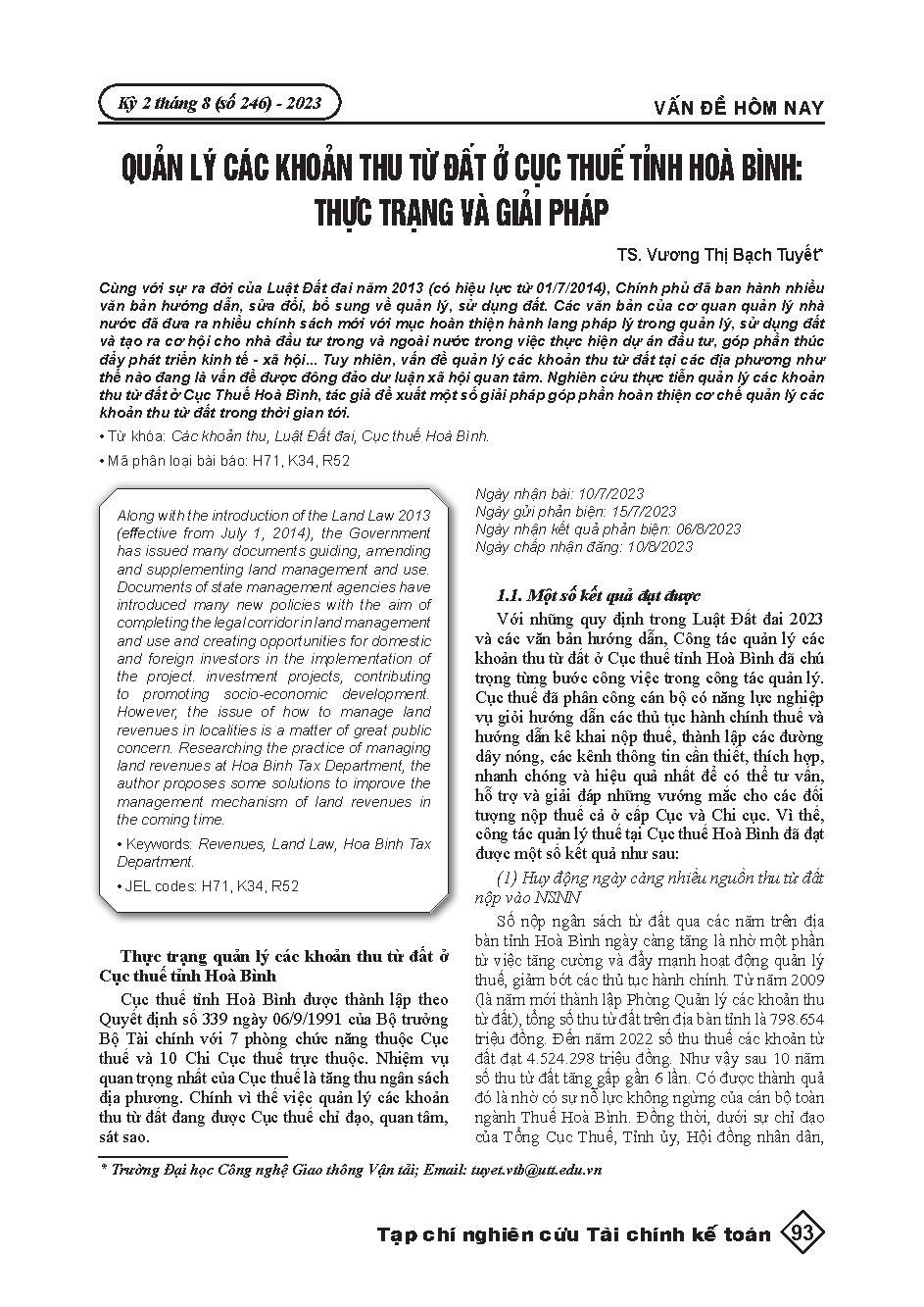 Quản lý các khoản thu từ đất ở Cục thuế tỉnh Hoà Bình: Thực trạng và giải pháp = Management of Revenue form Land at Hoabinh Province Tax Department: Current situation and solutions