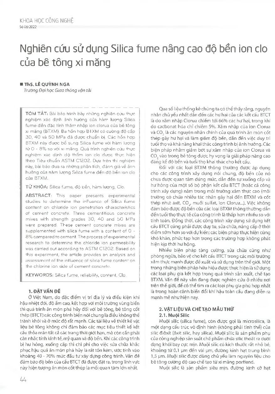 Nghiên cứu sử dụng Silica fume nâng cao độ bền ion do của bê tông xi măng = Research on use of Silica fume to enhance the Chlorine Ion resistance of cement concrete