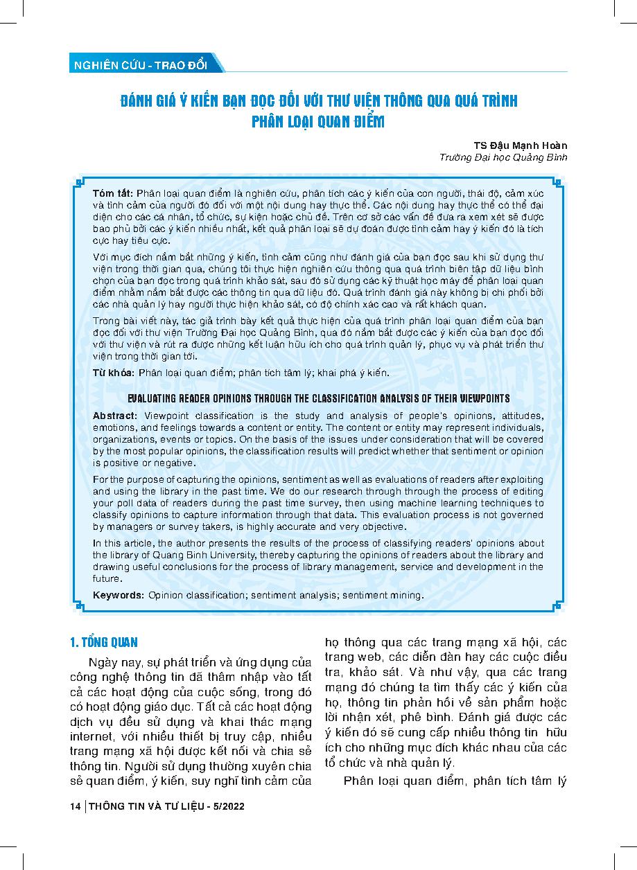 Đánh giá ý kiến bạn đọc đối với thư viện thông qua quá trình phân loại quan điểm = Evaluating reader opinions through the classification analysis of their viewpoints