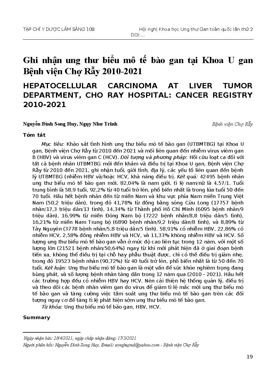 Ghi nhận ung thư biểu mô tế bào gan tại Khoa U gan Bệnh viện Chợ Rẫy 2010-2021 = Hepatocellular carcinoma at liver tumor department, cho ray hospital: cancer registry 2010-2021