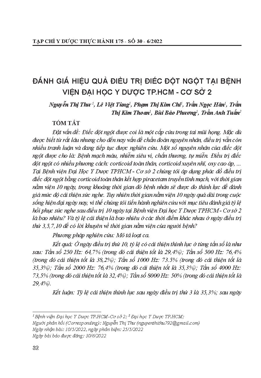Đánh giá hiệu quả điều trị điếc đột ngột tại Bệnh viện Đại học Y dược thành phố Hồ Chí Minh - Cơ sở 2 = Assessment of the efficiency of treatment of sudden deafness in the university medical center of Ho Chi Minh city - Branch 2