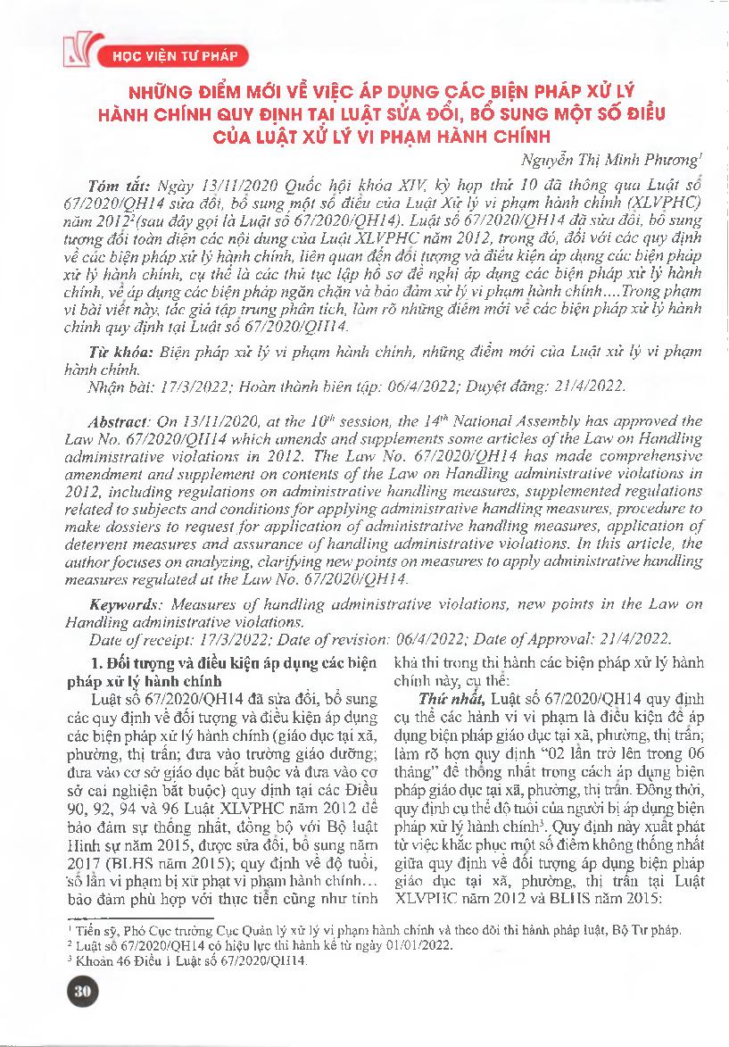 Những điểm mới về việc áp dụng các biện pháp xử lý hành chính quy định tại Luật sửa đổi, bổ sung một số điều của Luật Xử lý vi phạm hành chính = New points on applying administrative handling measures regulated in the Law amending and supplementing some a