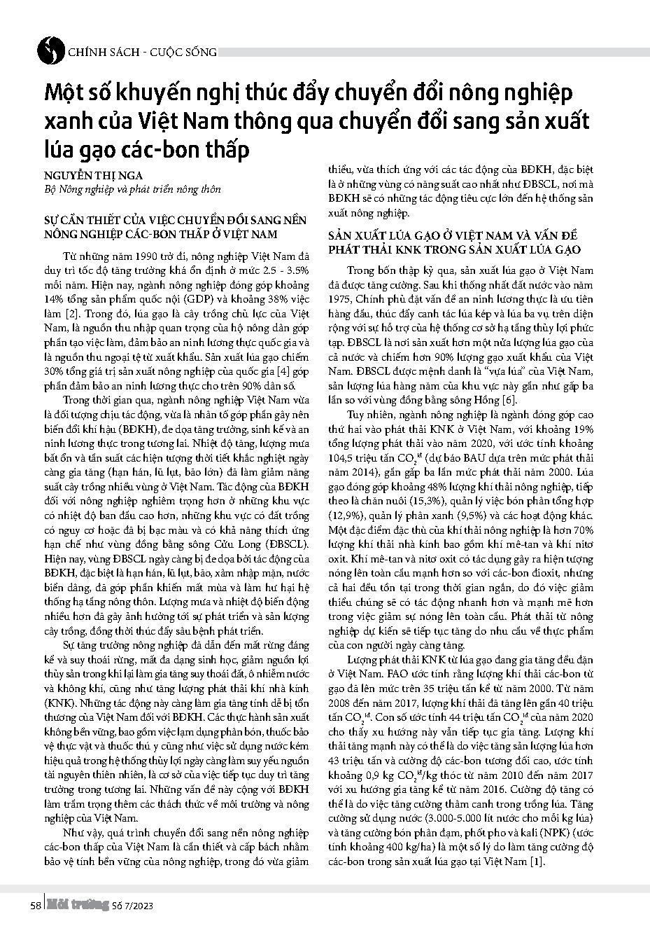 Một số khuyến nghị thúc đẩy chuyển đổi nông nghiệp xanh của Việt Nam thông qua chuyển đổi sang sản xuất lúa gạo các-bon thấp