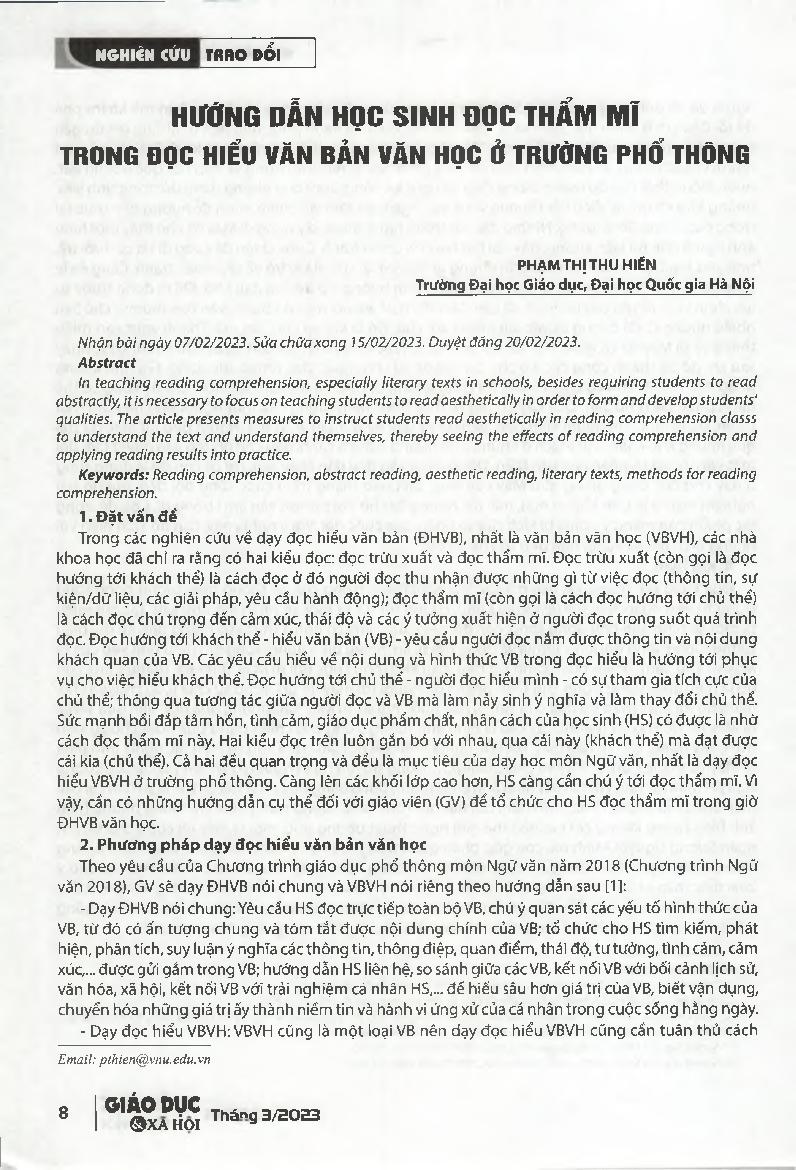 Hướng dẫn học sinh đọc thẩm mĩ trong đọc hiểu văn bản văn học ở trường phổ thông = Instructions for students to read aesthetically in reading comprehension in schools.