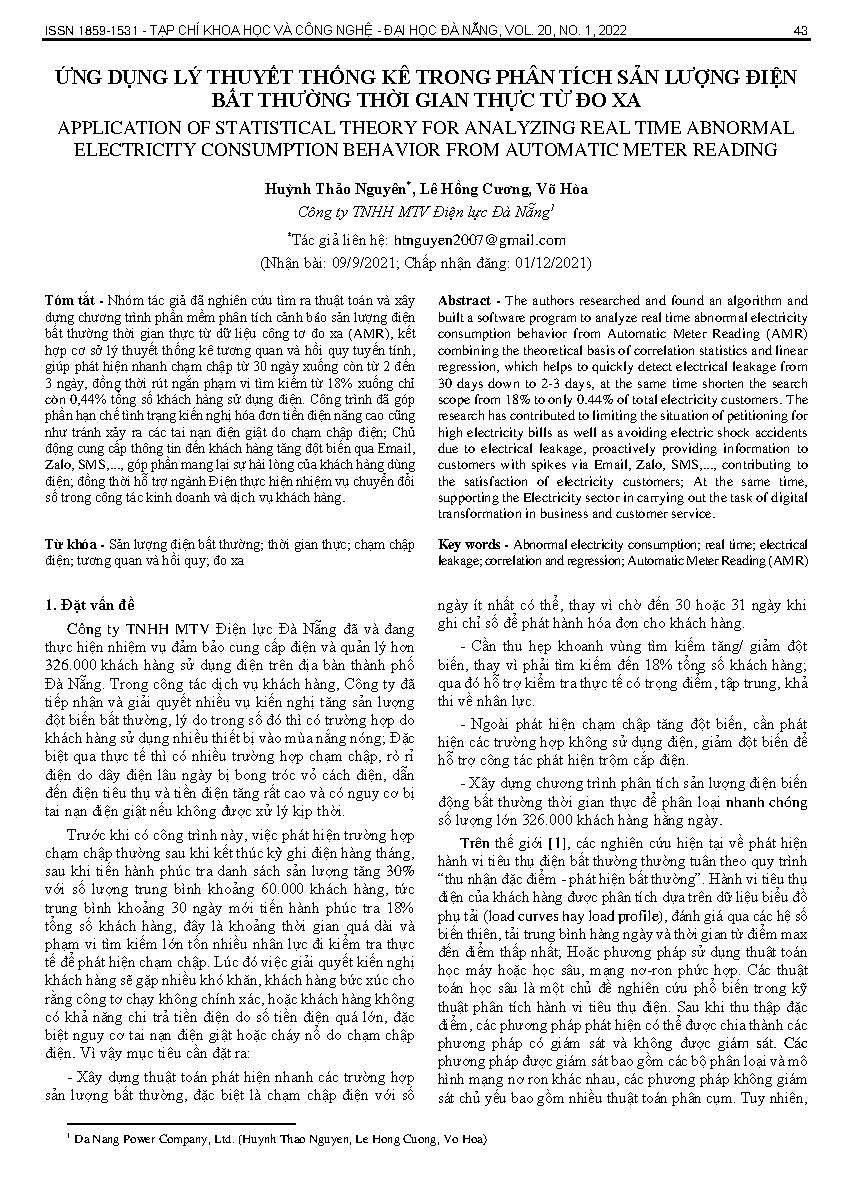 Ứng dụng lý thuyết thống kê trong phân tích sản lượng điện bất thường thời gian thực từ đo xa = Application of statistical theory for analyzing real time abnormal electricity consumption behavior from automatic meter reading