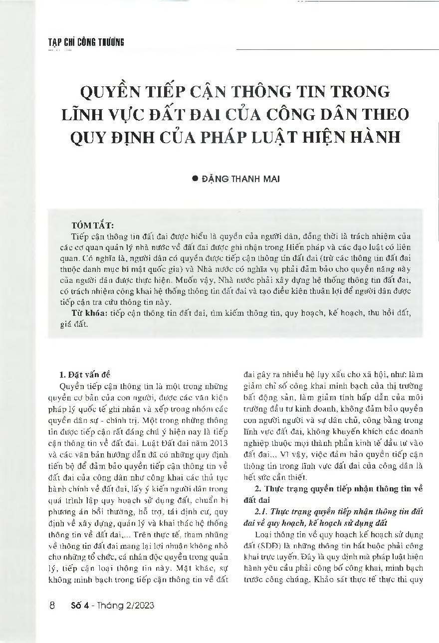 Quyền tiếp cận thông tin trong lĩnh vực đất đai của công dân theo quy định của pháp luật hiện hành = The right of access to land information under current Vietnam's laws