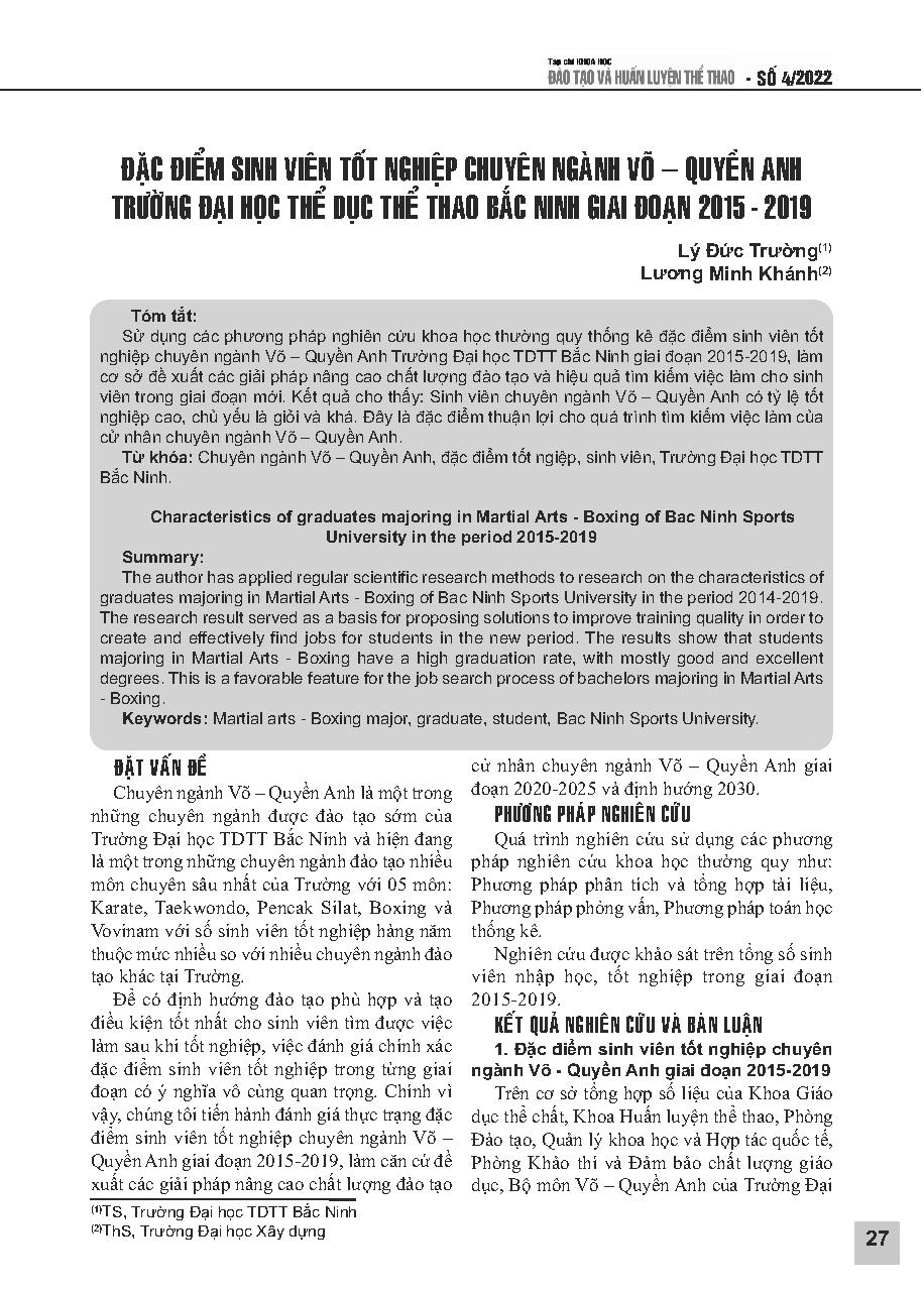 Đặc điểm sinh viên tốt nghiệp chuyên ngành võ – quyền anh Trường Đại học Thể dục thể thao Bắc Ninh giai đoạn 2015-2019 = Characteristics of graduates majoring in Martial Arts - Boxing of Bac Ninh Sports University in the period 2015-2019