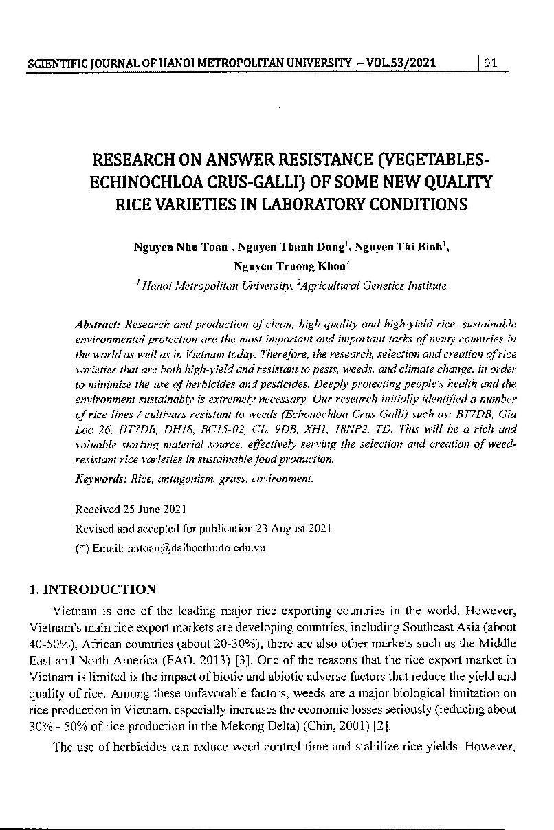 Nghiên cứu khả năng kháng cỏ dại (cỏ lồng vực - Echinochloa Crus-Galli) của một số dòng giống lúa chất lượng mới trong điều kiện phòng thí nghiệm = Research on answer resistance (vegetables- Echonochloa Crus-Galli) of some new quality rice varieties in laboratory conditions