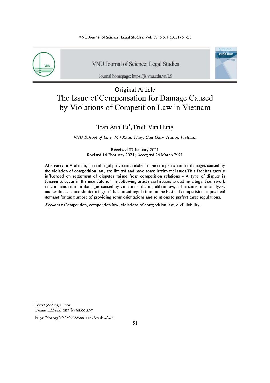Bồi thường thiệt hại do hành vi vi phạm pháp luật cạnh tranh gây ra tại Việt Nam = The issue of compensation for damage caused by violations of competition law in Vietnam