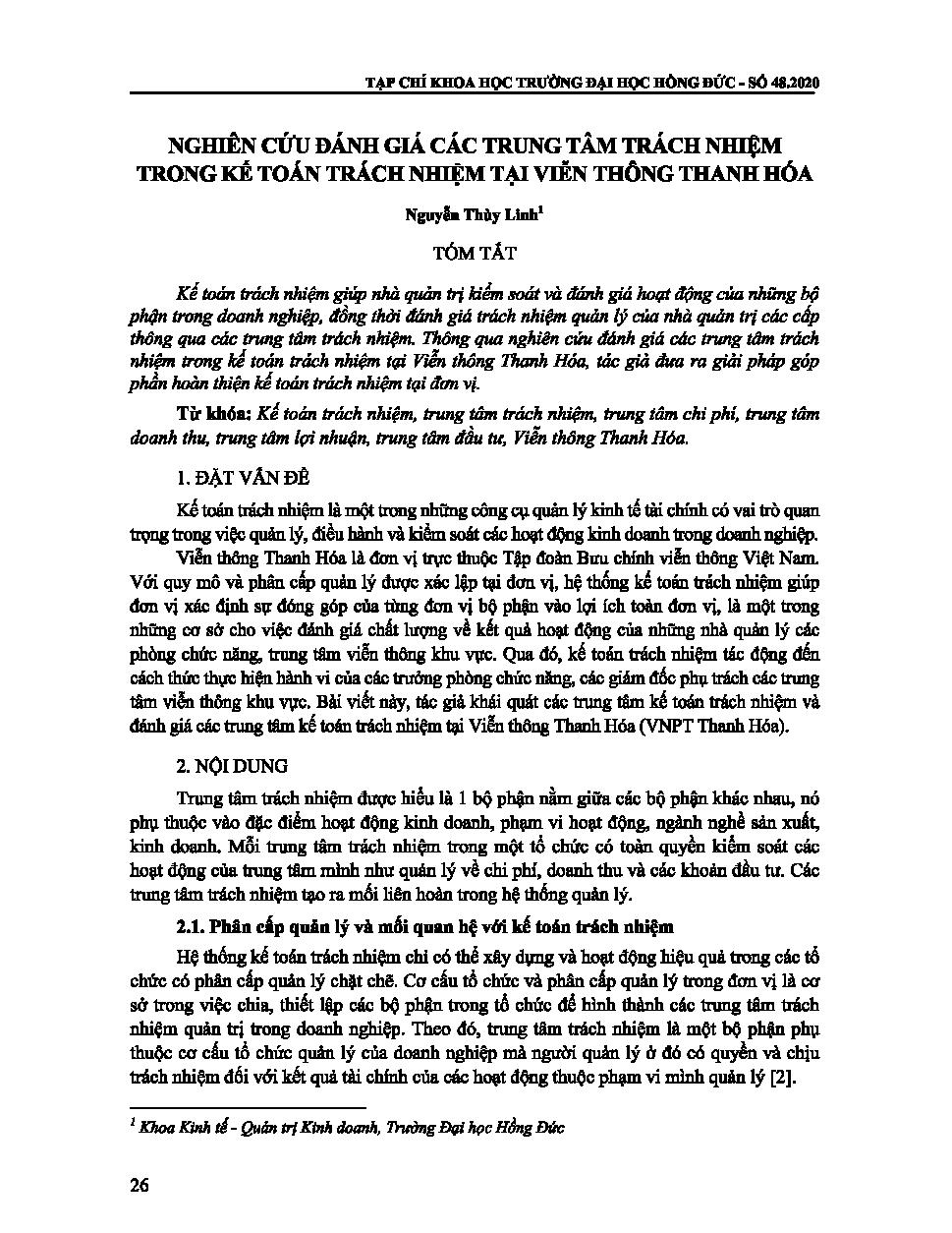 NGHIÊN CỨU ĐÁNH GIÁ CÁC TRUNG TÂM TRÁCH NHIỆM TRONG KẾ TÓAN TRÁCH NHIỆM TẠI VIỄN THÔNG THANH HÓA = STUDY ON ASSESSMENT OF RESPONSIBILITY CENTERS IN RESPONSIBILITY ACCOUNTING IN THANH HOA TELECOMMUNICATIONS