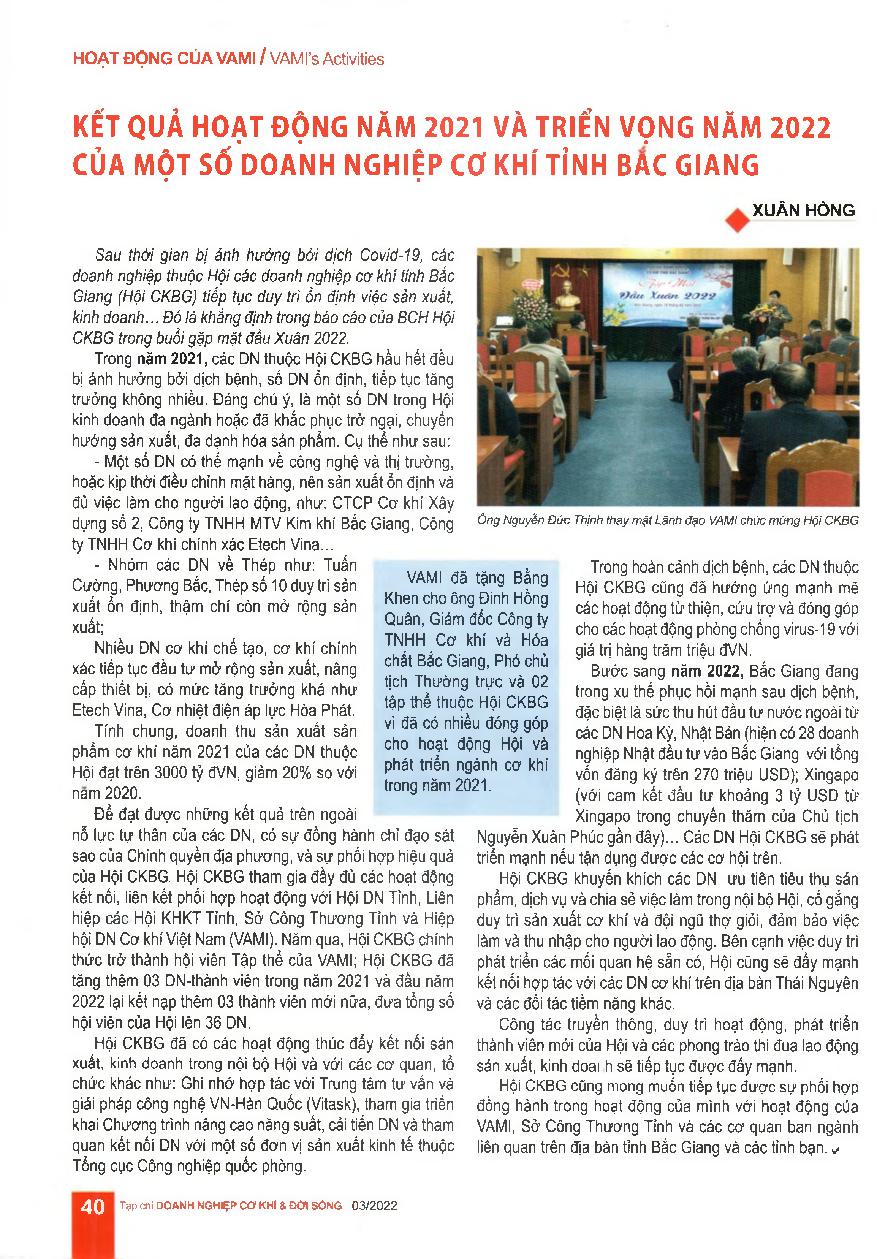 Kết quả hoạt động năm 2021 và triển vọng năm 2022 của một số doanh nghiệp cơ khí tỉnh Bắc Giang = Performance results in 2021 and prospects in 2022 of some mechanical enterprises in Bac Giang province