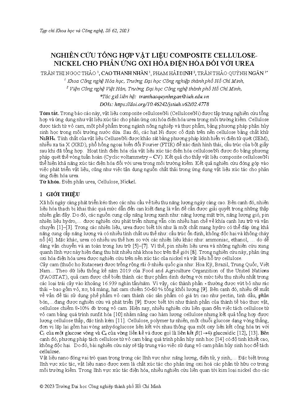 Nghiên cứu tổng hợp vật liệu composite cellulose-nickel cho phản ứng oxi hóa điện hóa đối với urea = Synthetic composite cellulose/nickel for urea electrooxidation catalytic
