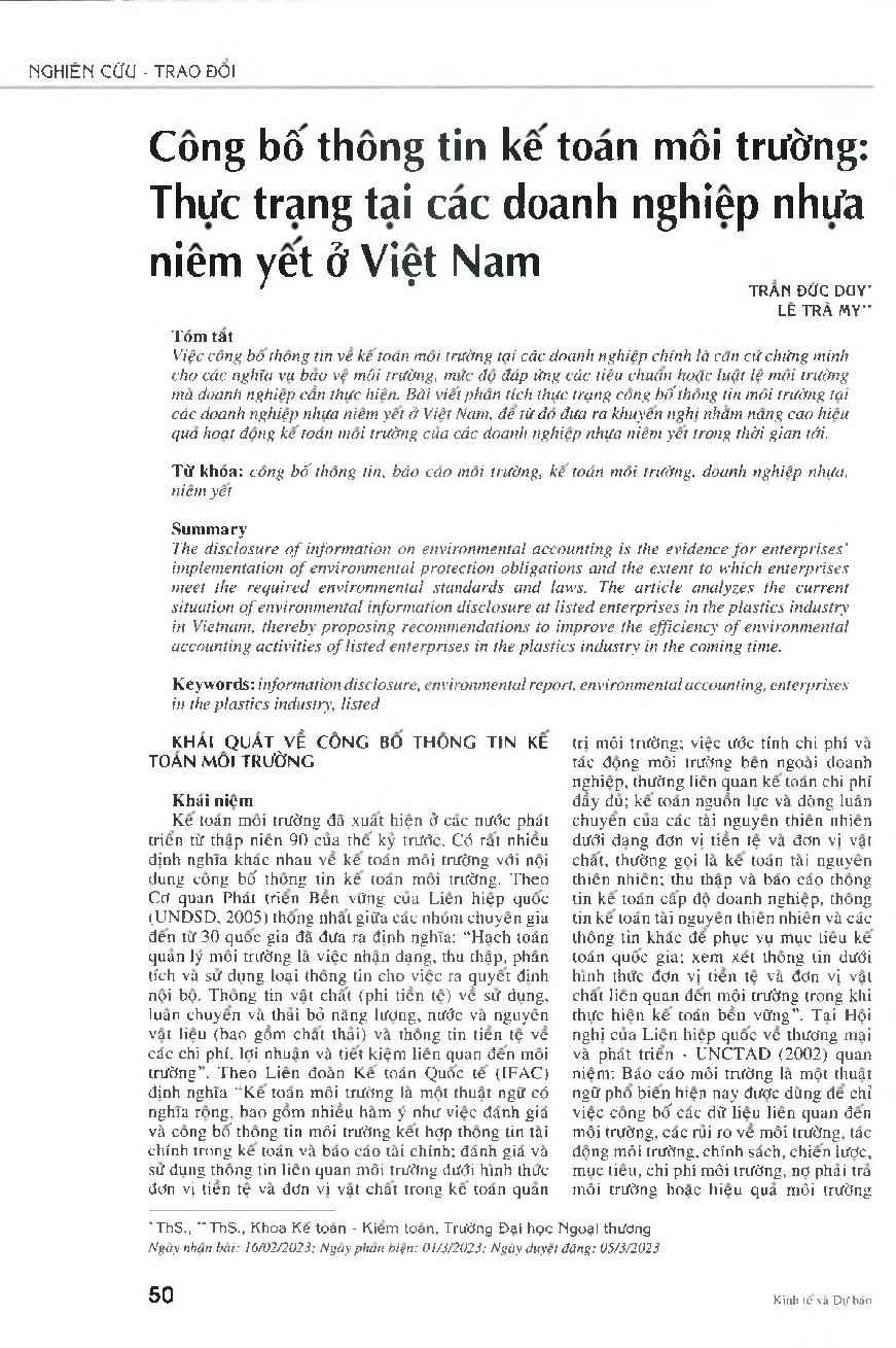 Công bố thông tin kế toán môi trường: Thực trạng tại các doanh nghiệp nhựa niêm yết ở Việt Nam