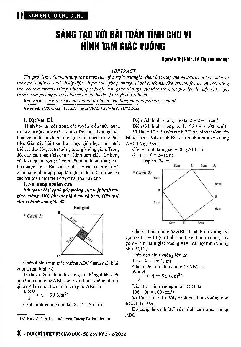 Sáng tạo với bài toán tính chu vi hình tam giác vuôn = Creative with the problem of calculating the perimeter of a right triangle