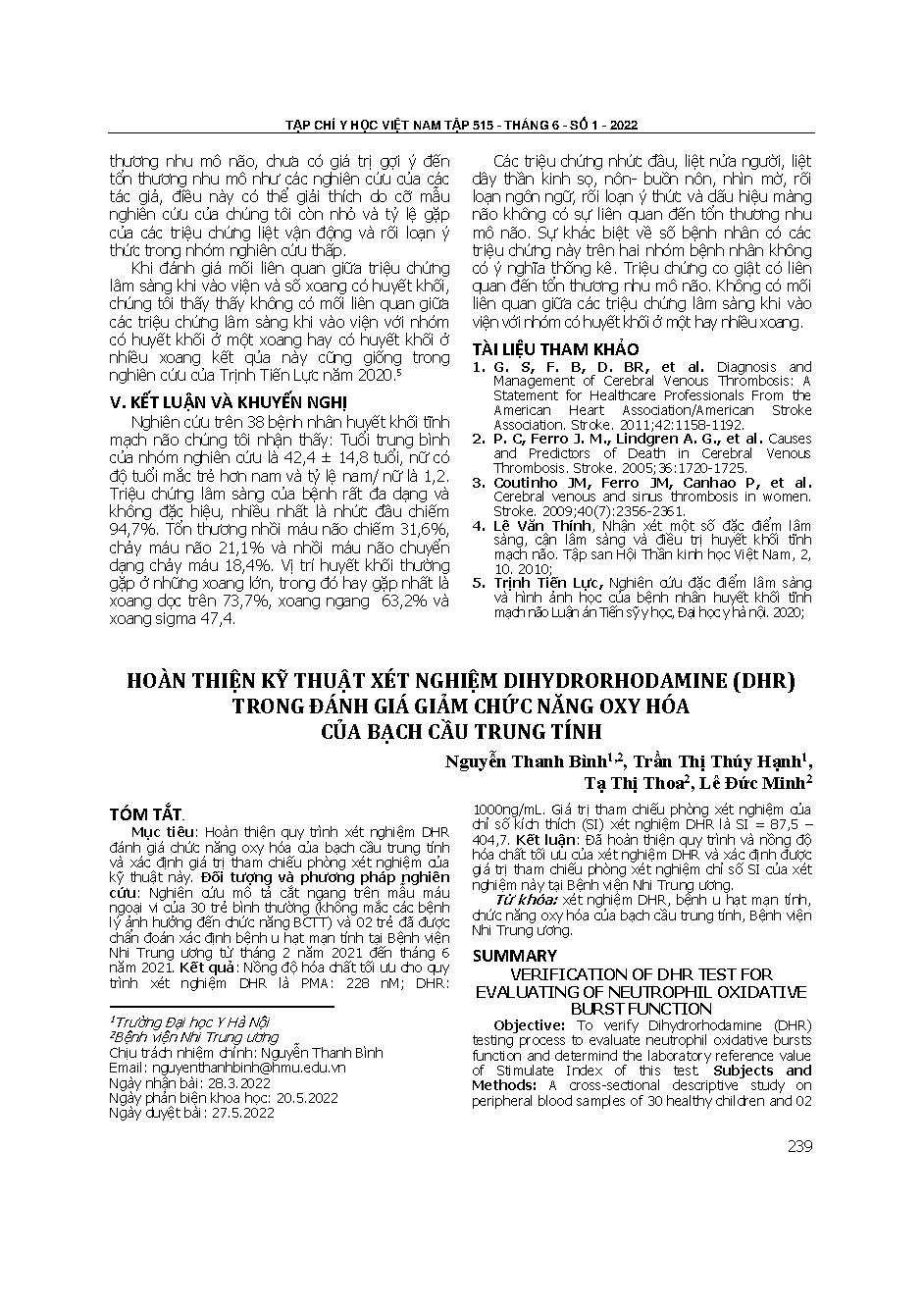 Hoàn thiện kỹ thuật xét nghiệm dihydroergotamine (DHR) trong đánh giá giảm chức năng oxy hóa của bạch cầu trung tính = Verification of DHR test for evaluating of neutrophil oxidative burst function