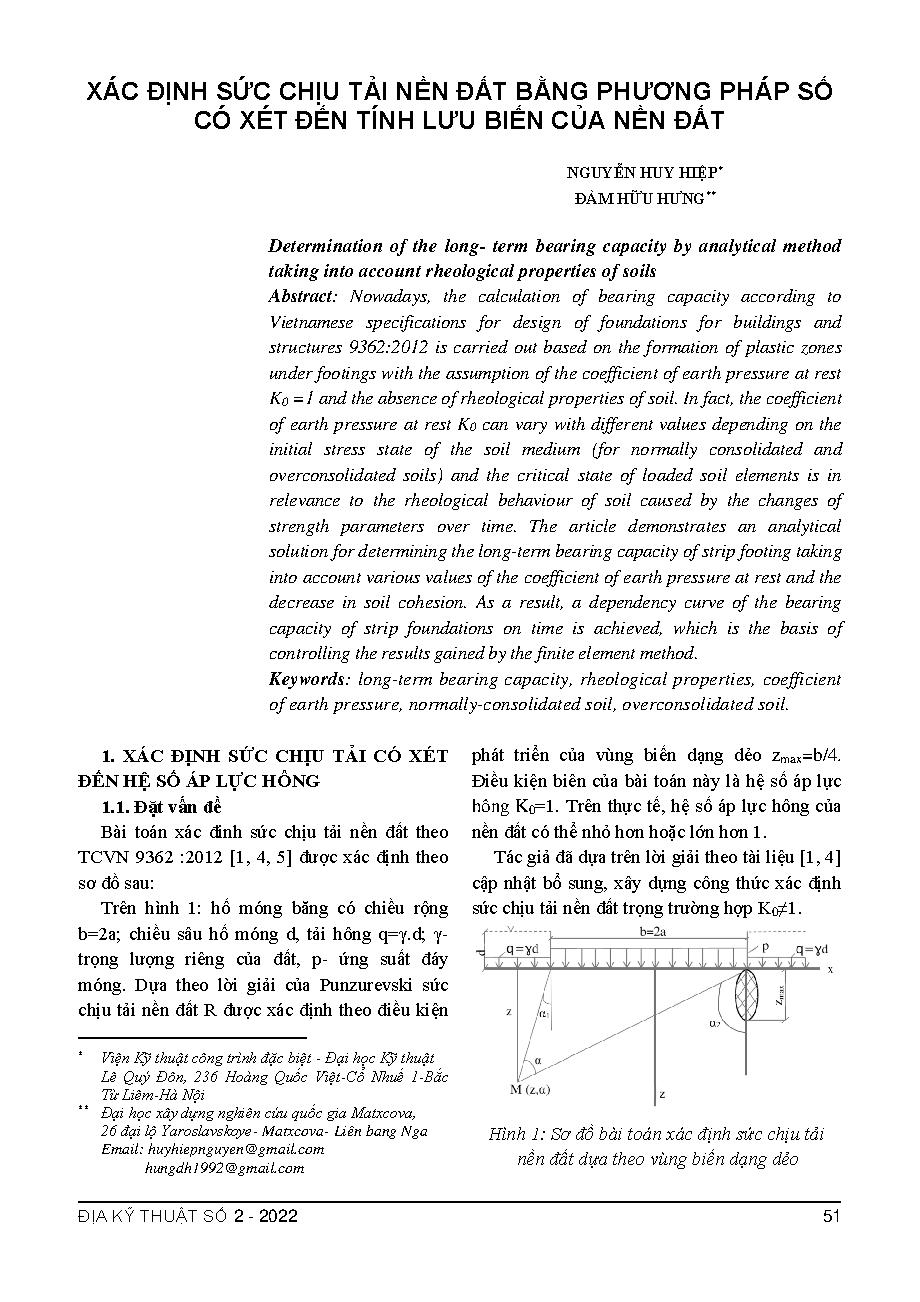 Xác định sức chịu tải nền đất bằng phương pháp số có xét đến tính lưu biến của nền đất = Determination of the long- term bearing capacity by analytical method taking into account rheological properties of soils