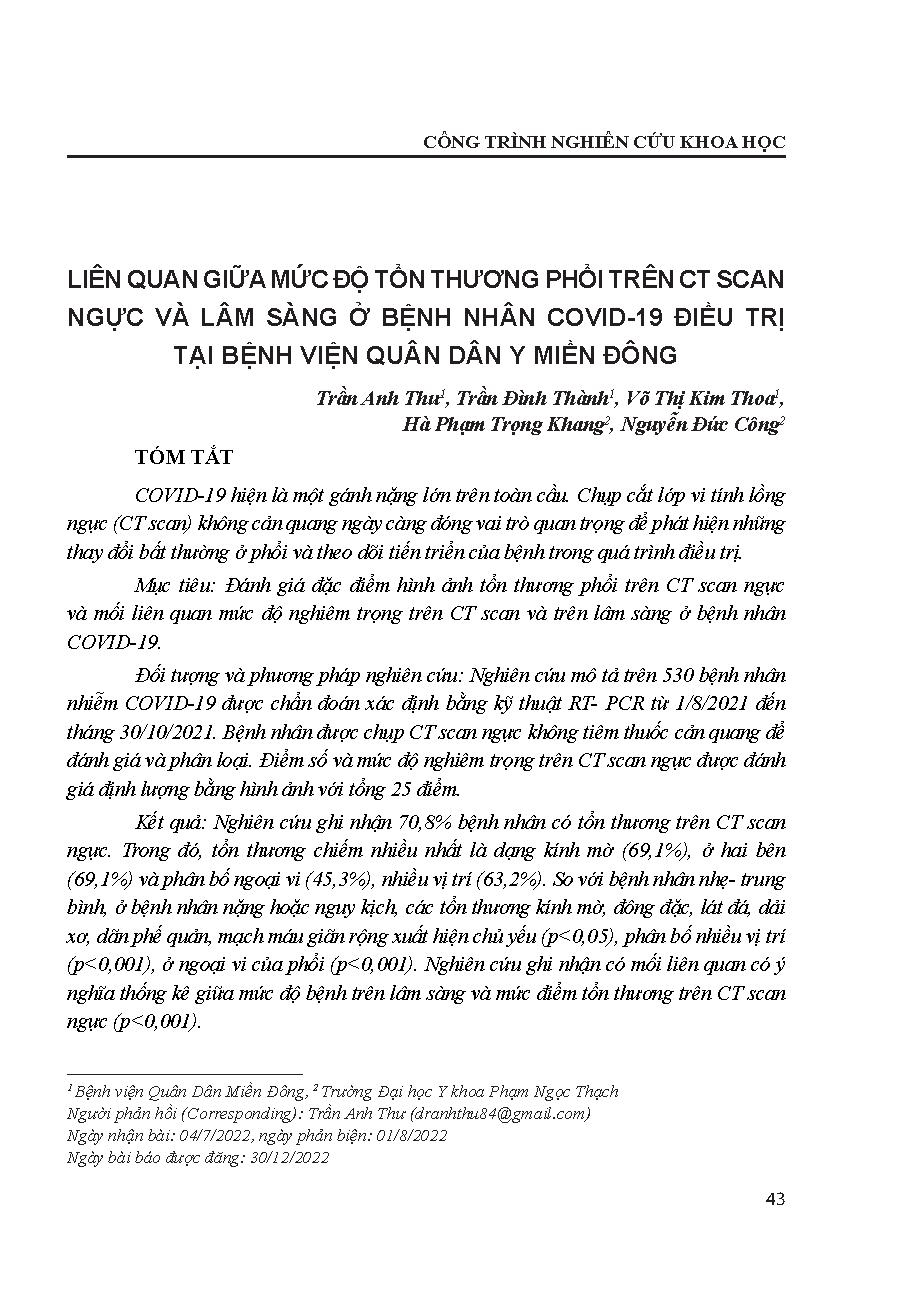 Liên quan giữa mức độ tổn thương phổi trên CT scan ngực và lâm sàng ở bệnh nhân Covid-19 điều trị tại Bệnh viện Quân dân Y Miền Đông