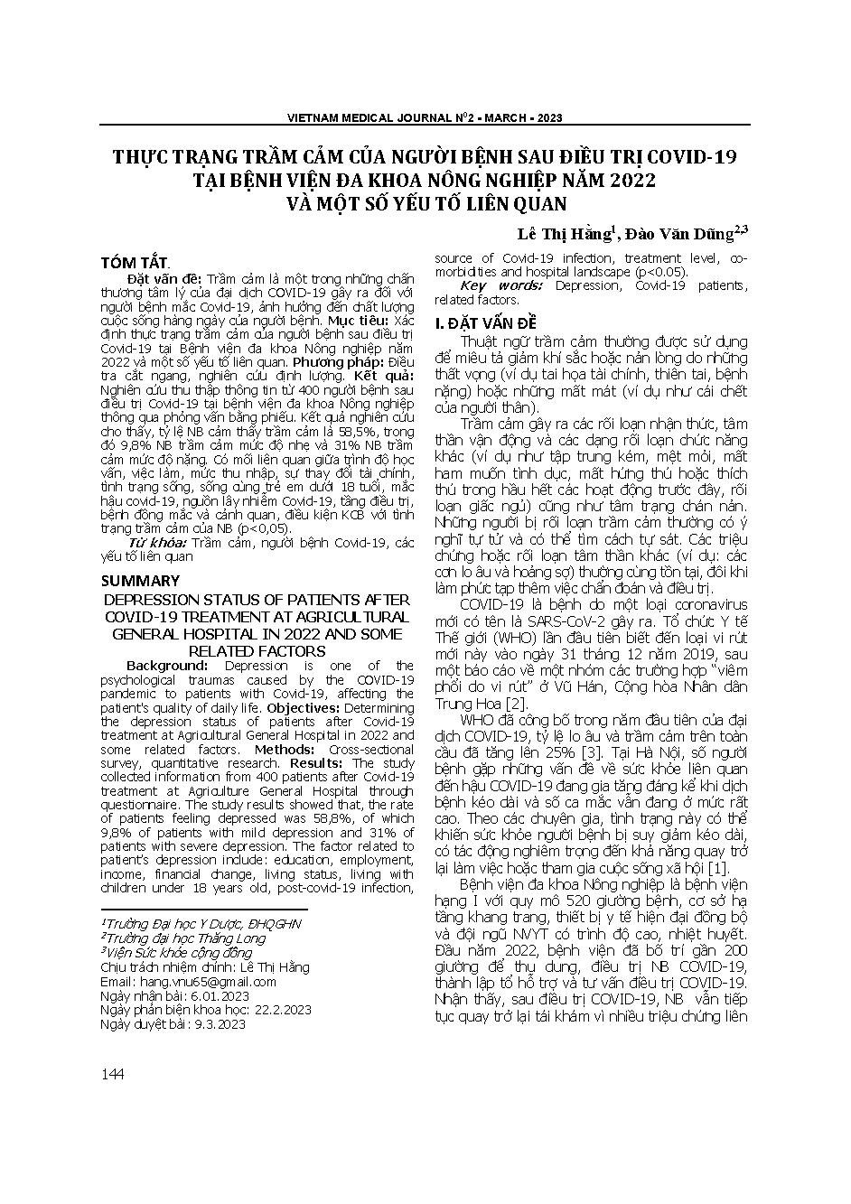 Thực trạng trầm cảm của người bệnh sau điều trị Covid-19 tại Bệnh viện Đa khoa Nông nghiệp năm 2022 và một số yếu tố liên quan = Depression status of patients after Covid-19 treatment at Agricultural general hospital in 2022 and some related factors