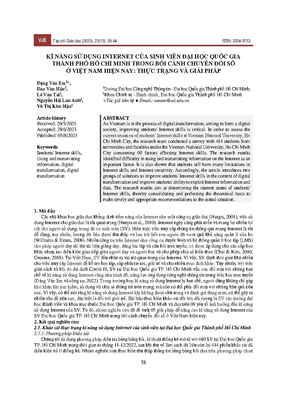 Kĩ năng sử dụng internet của sinh viên Đại học Quốc gia Thành phố Hồ Chí Minh trong bối cảnh chuyển đổi số ở Việt Nam hiện nay: thực trạng và giải pháp = Internet skills of students at Vietnam National University, Ho Chi Minh City in the context of digita