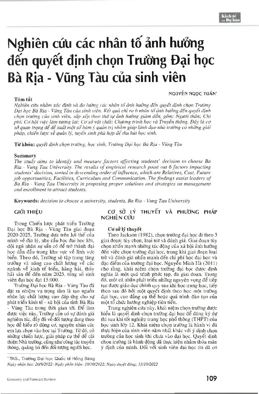 Nghiên cứu các nhân tố ảnh hưởng đến quyết định chọn Trường Đại học Bà Rịa - Vũng Tàu của sinh viên = Research on factors affecting students’ decision to choose Ba Ria - Vung Tau University