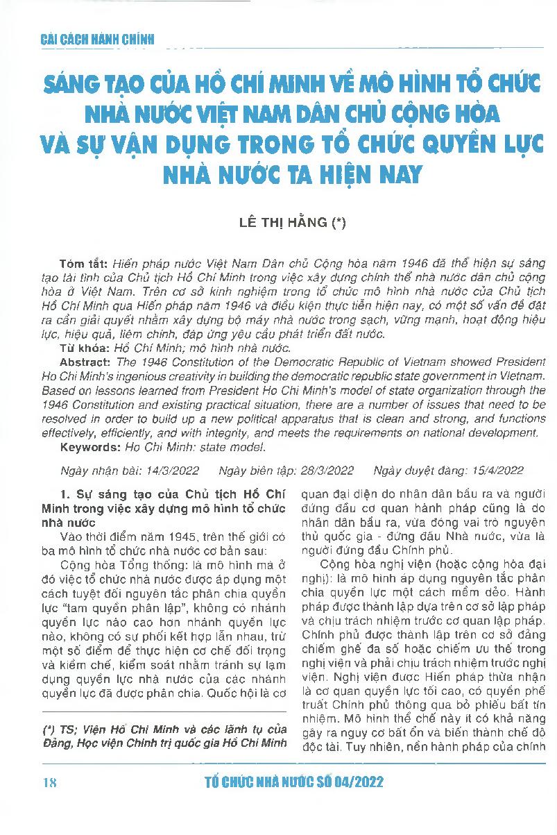 Sáng tạo của Hồ Chí Minh về mô hình tổ chức nhà nước Việt Nam dân chủ cộng hòa và sự vận dụng trong tổ chức quyền lực nhà nước ta hiện nay = Creative model of state organization of the Democratic Republic of Vietnam by Ho Chi Minh and its application in t