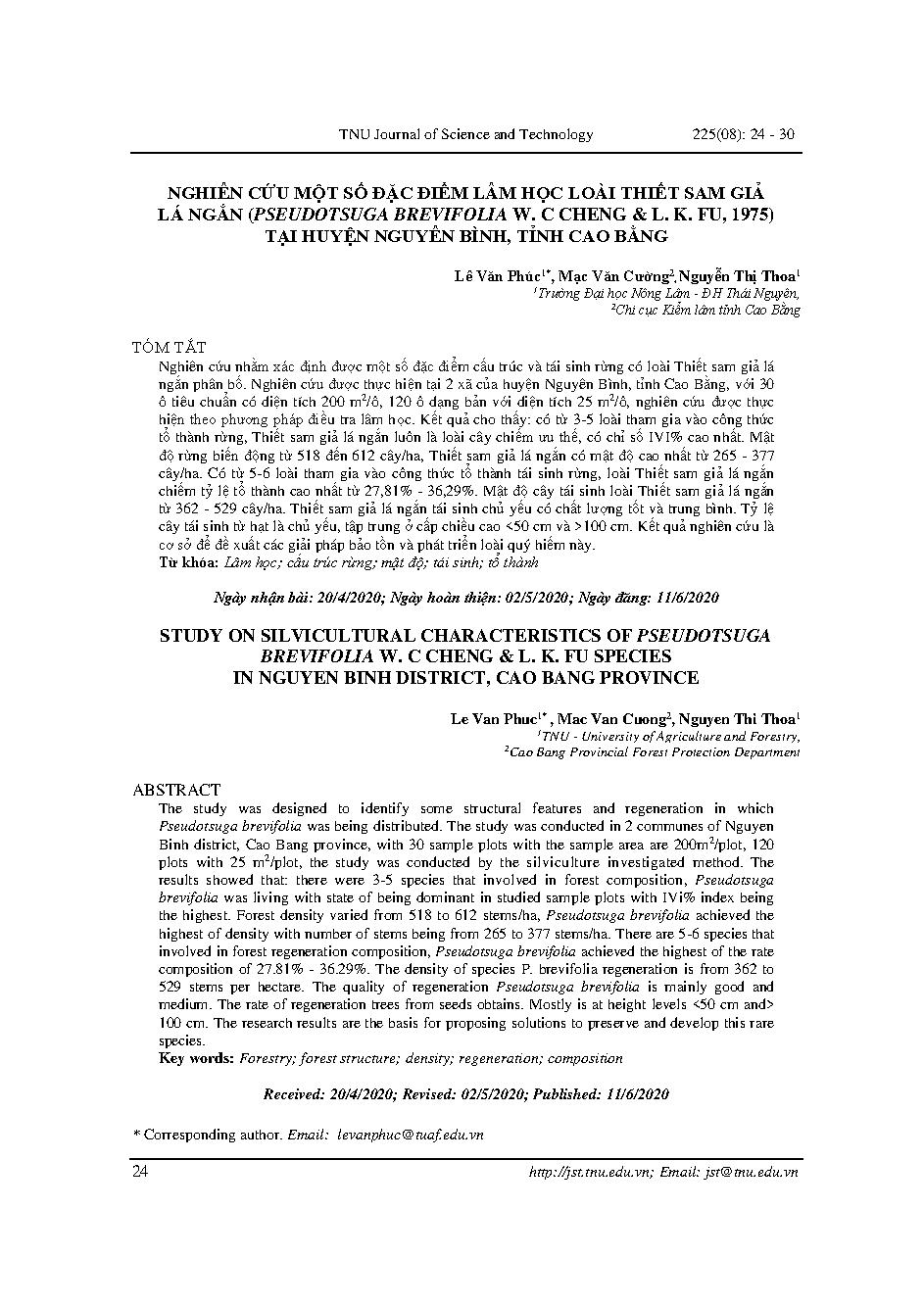 Nghiên cứu một số đặc điểm lâm học loài thiết sam giả lá ngắn (Pseudotsuga brevifolia W.C Cheng & I. K. Fu, 1975) tại huyện Nguyên Bình, tỉnh Cao Bằng = Study on silvicultural characteristics of Pseudotsuga brevifolia W. C Cheng & I. K. Fu species in Nguyen Binh district, Cao Bang province
