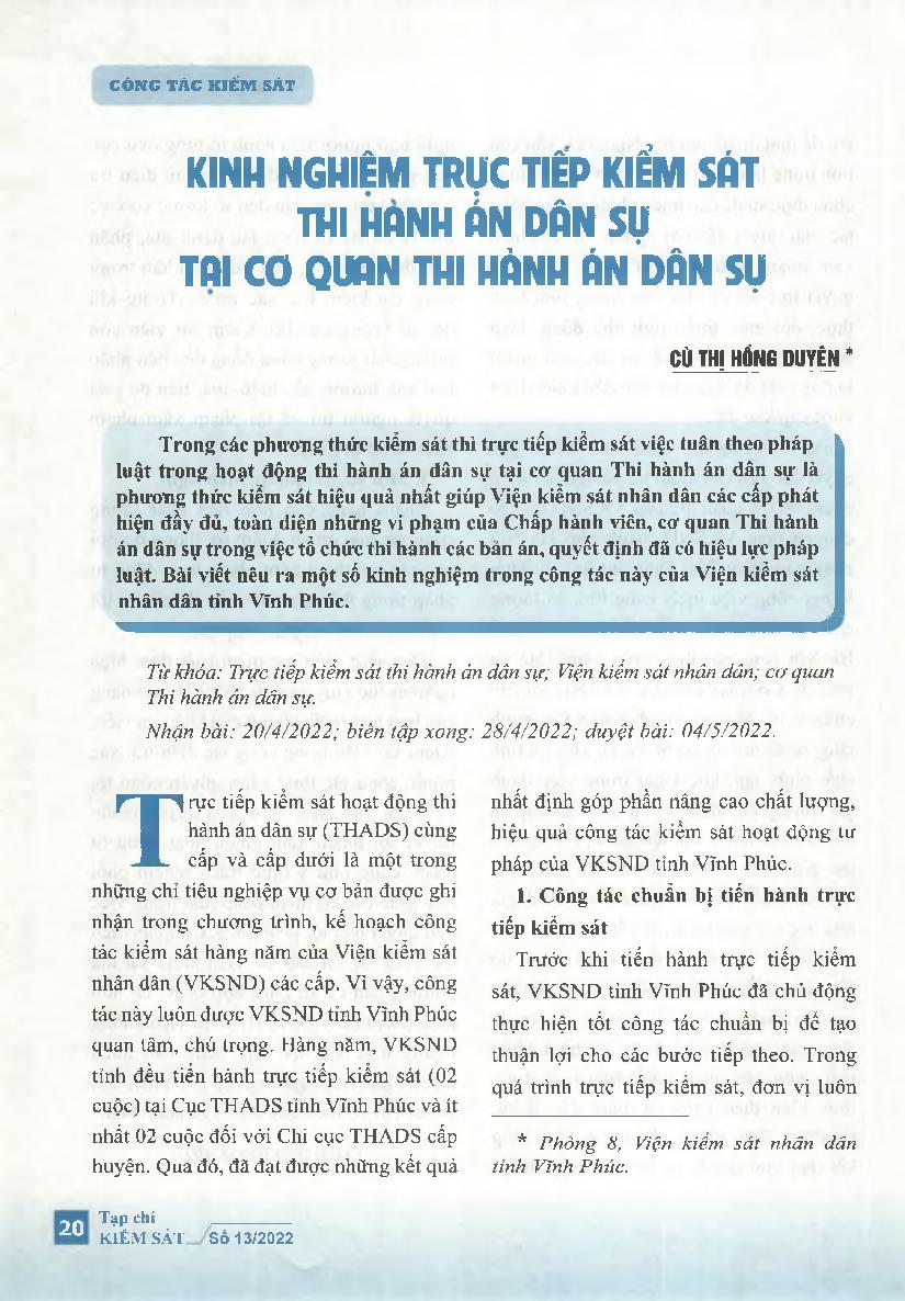Kinh nghiệm trực tiếp kiểm sát thi hành án dân sự tại cơ quan Thi hành án dân sự = Experience in directly supervising civil judgment enforcement at civil judgment enforcement agencies