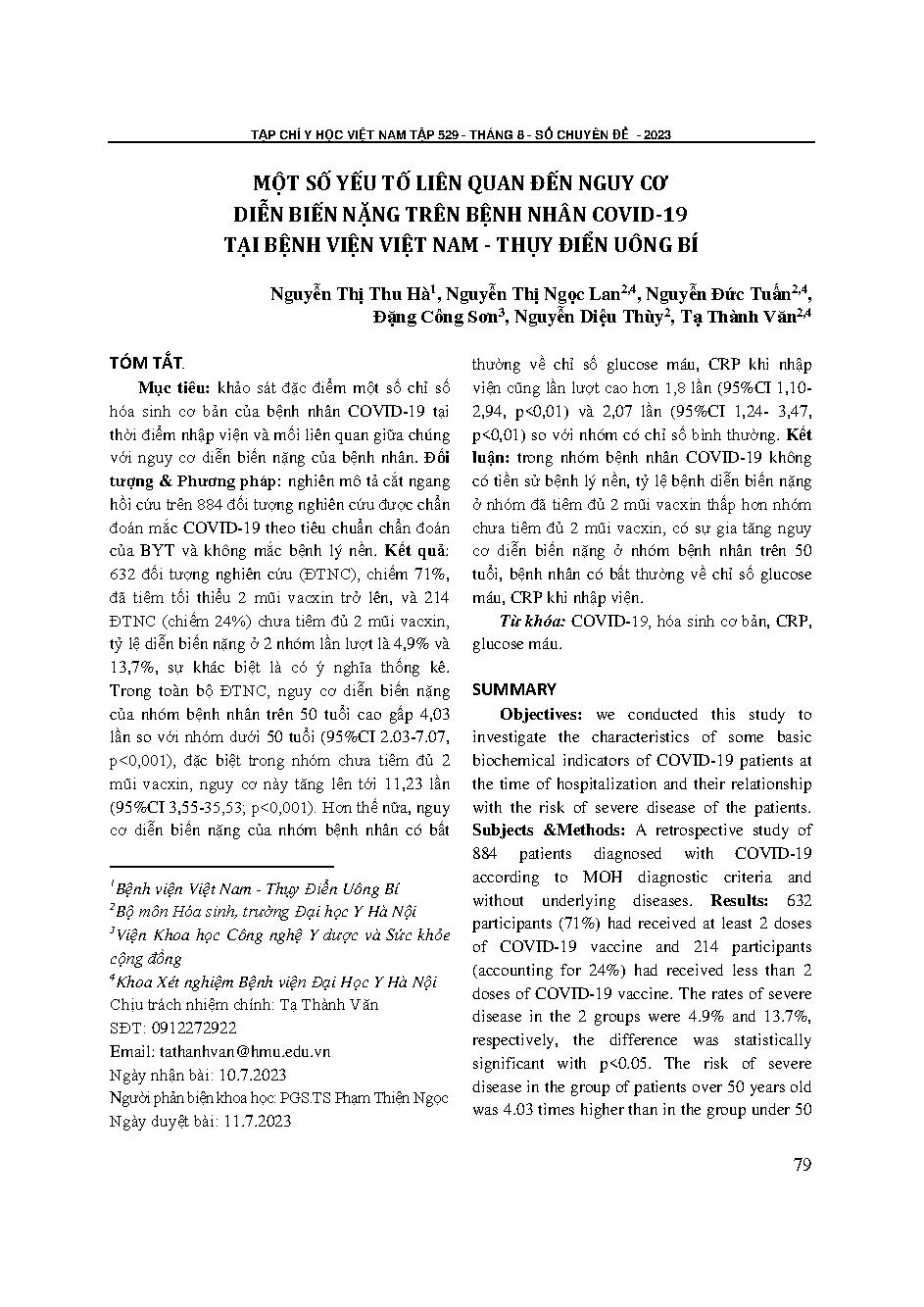 Một số yếu tố liên quan đến nguy cơ diễn biến nặng trên bệnh nhân Covid-19 tại Bệnh viện Việt Nam - Thụy Điển Uông Bí