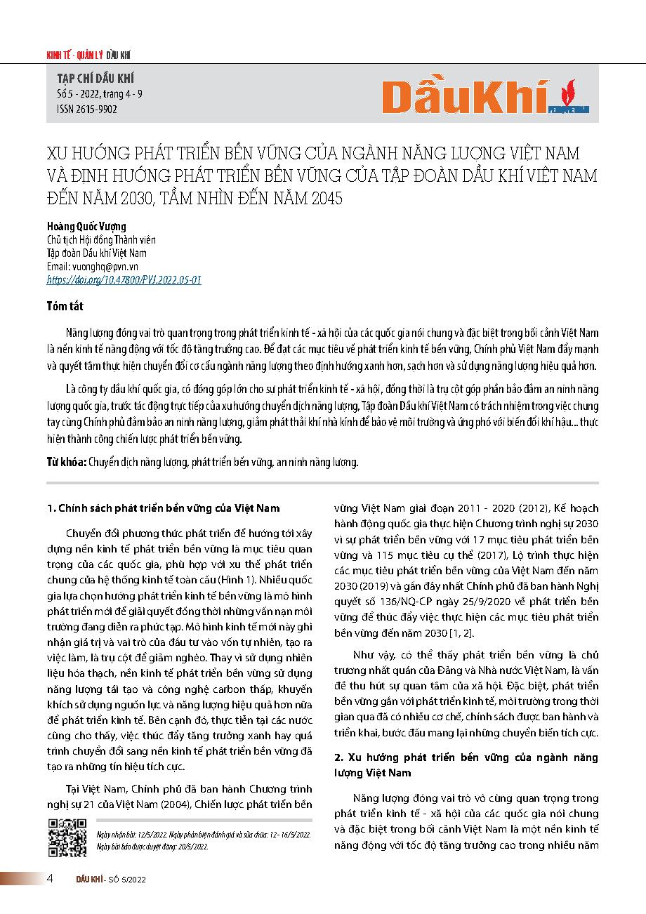 Xu hướng phát triển bền vững của ngành năng lượng Việt Nam và định hướng phát triển bền vững của Tập đoàn Dầu khí Việt Nam đến năm 2030, tầm nhìn đến năm 2045 = Sustainable development trend of Vietnam&; 39;s energy industry and orientations for sustainabl