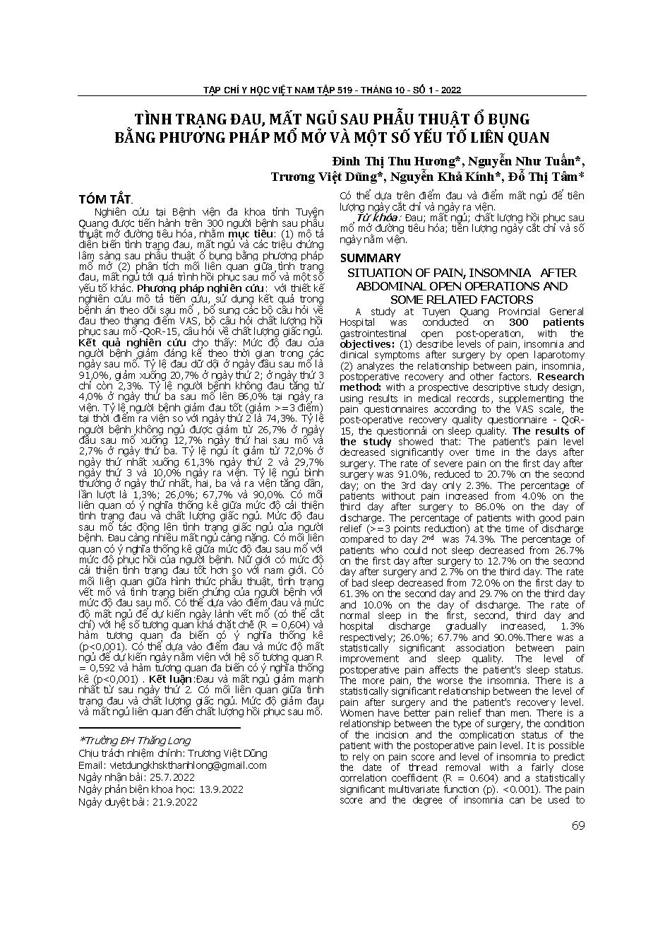 Tình trạng đau, mất ngủ sau phẫu thuật ổ bụng bằng phương pháp mổ mở và một số yếu tố liên quan = Situation of pain, insomnia after abdominal open operations and some related factors